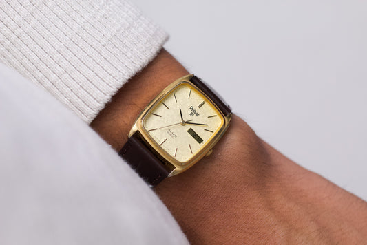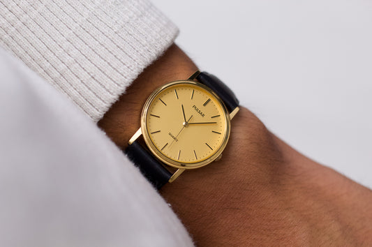 1995 Pulsar Quartz Straight Grain Golden Dial Men's Wrist-Watch W/Box