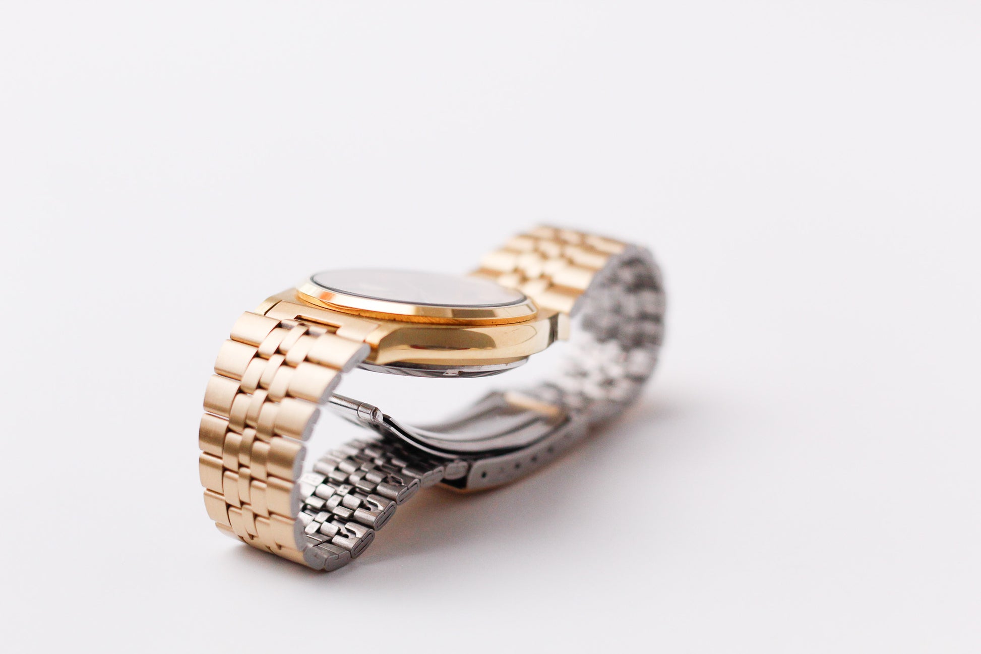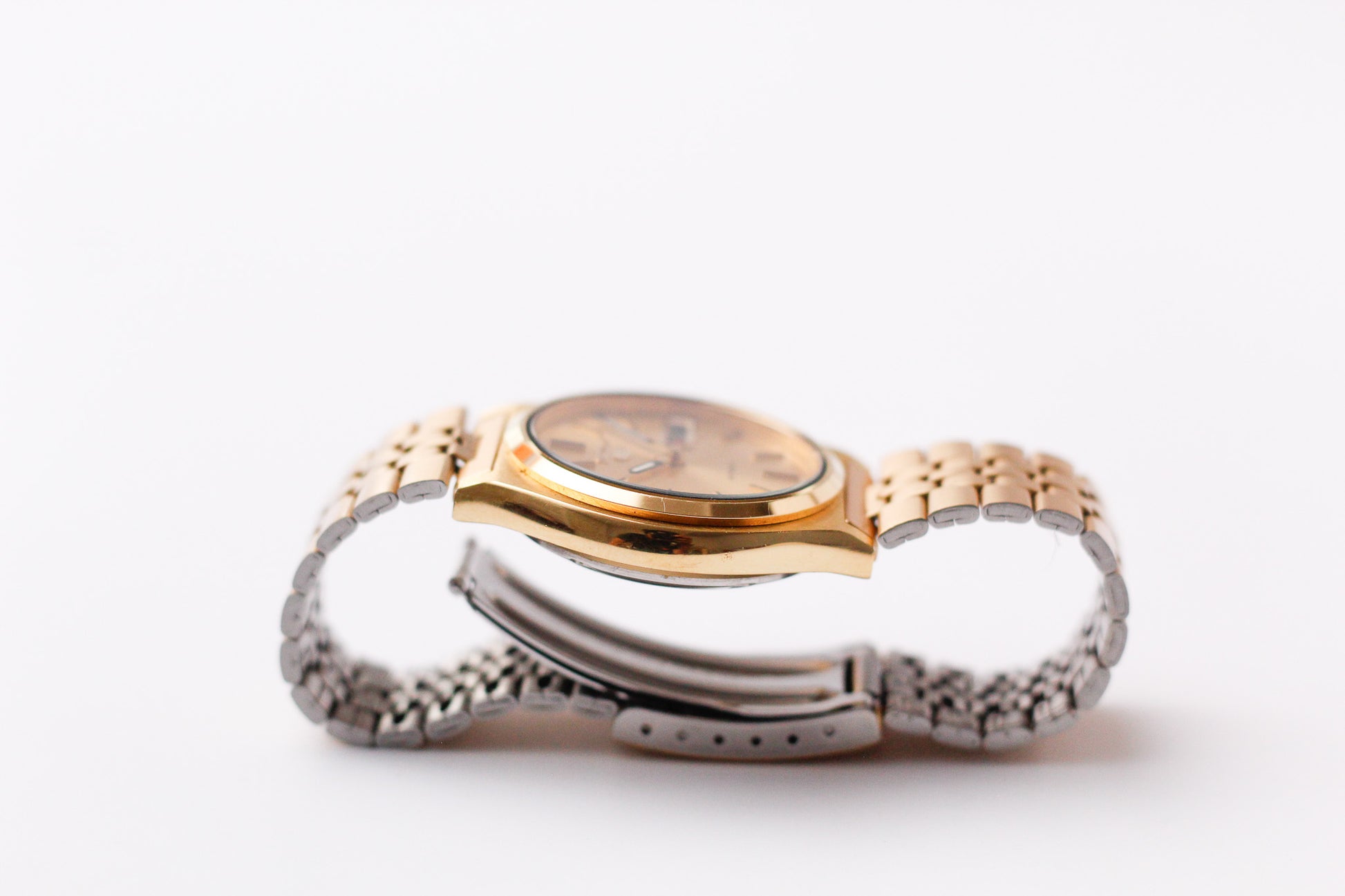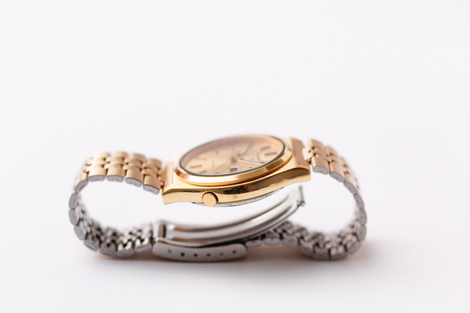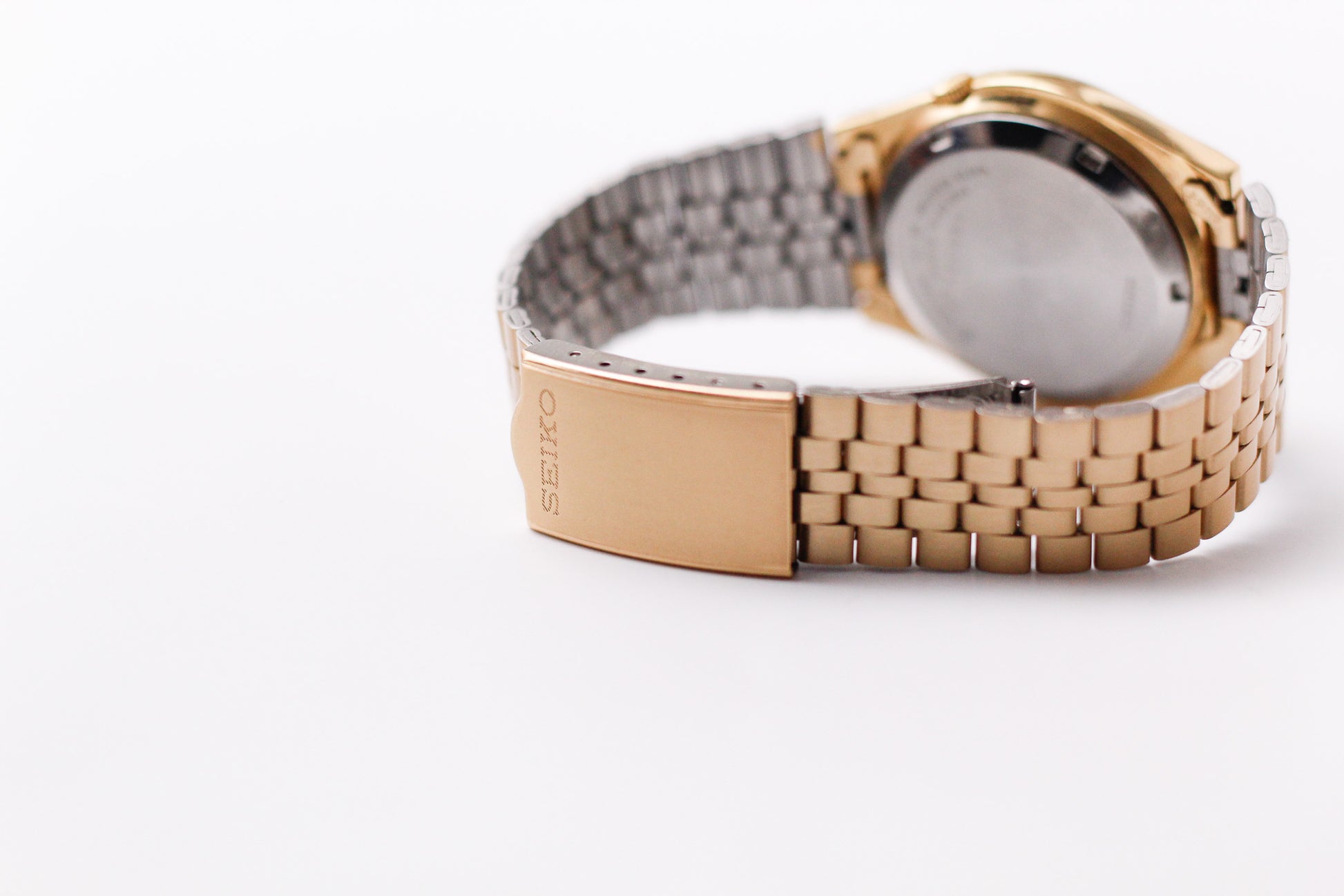 Housing this watch is a gold toned case and bracelet that sits on the wrist confidently.
