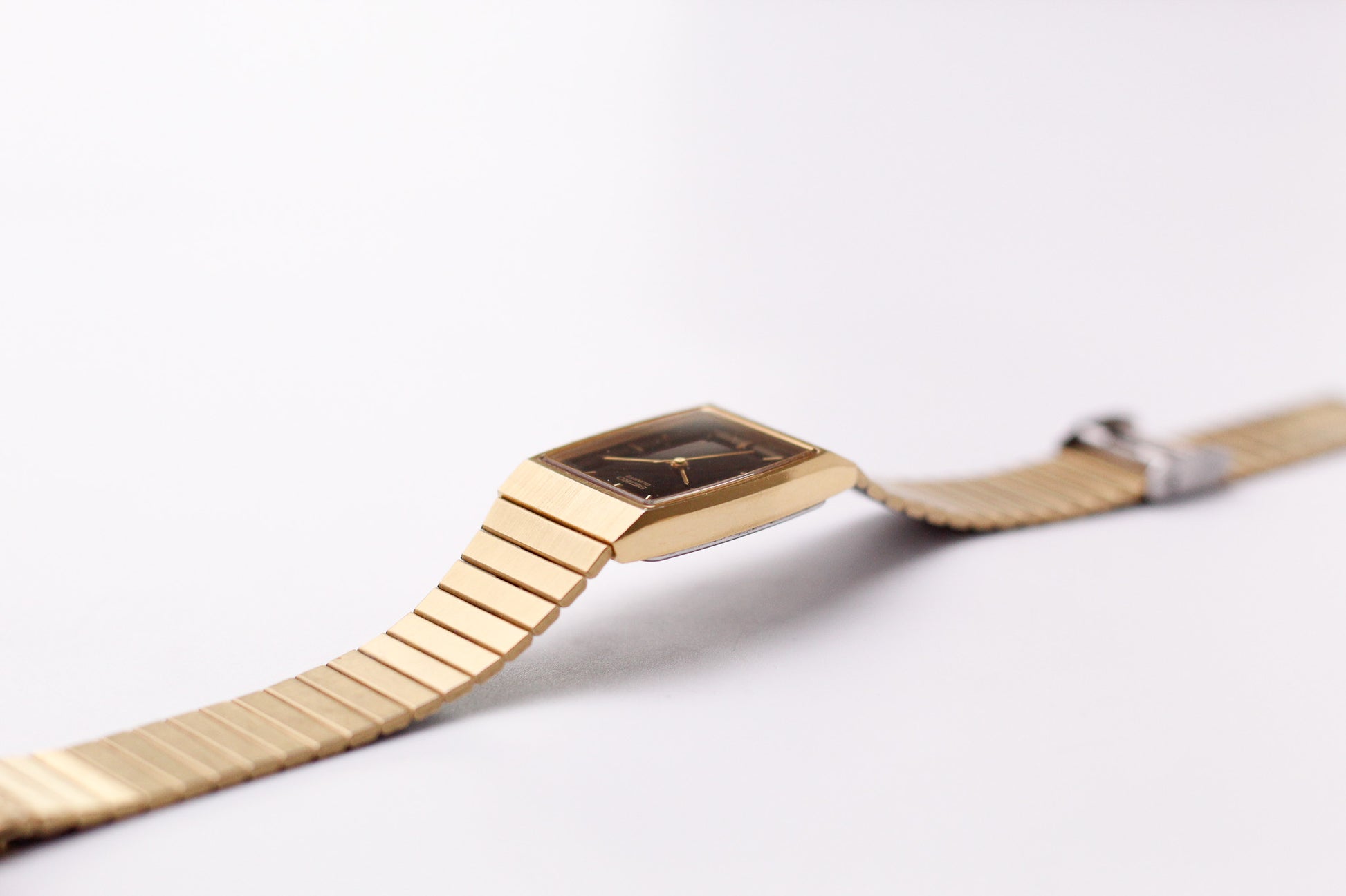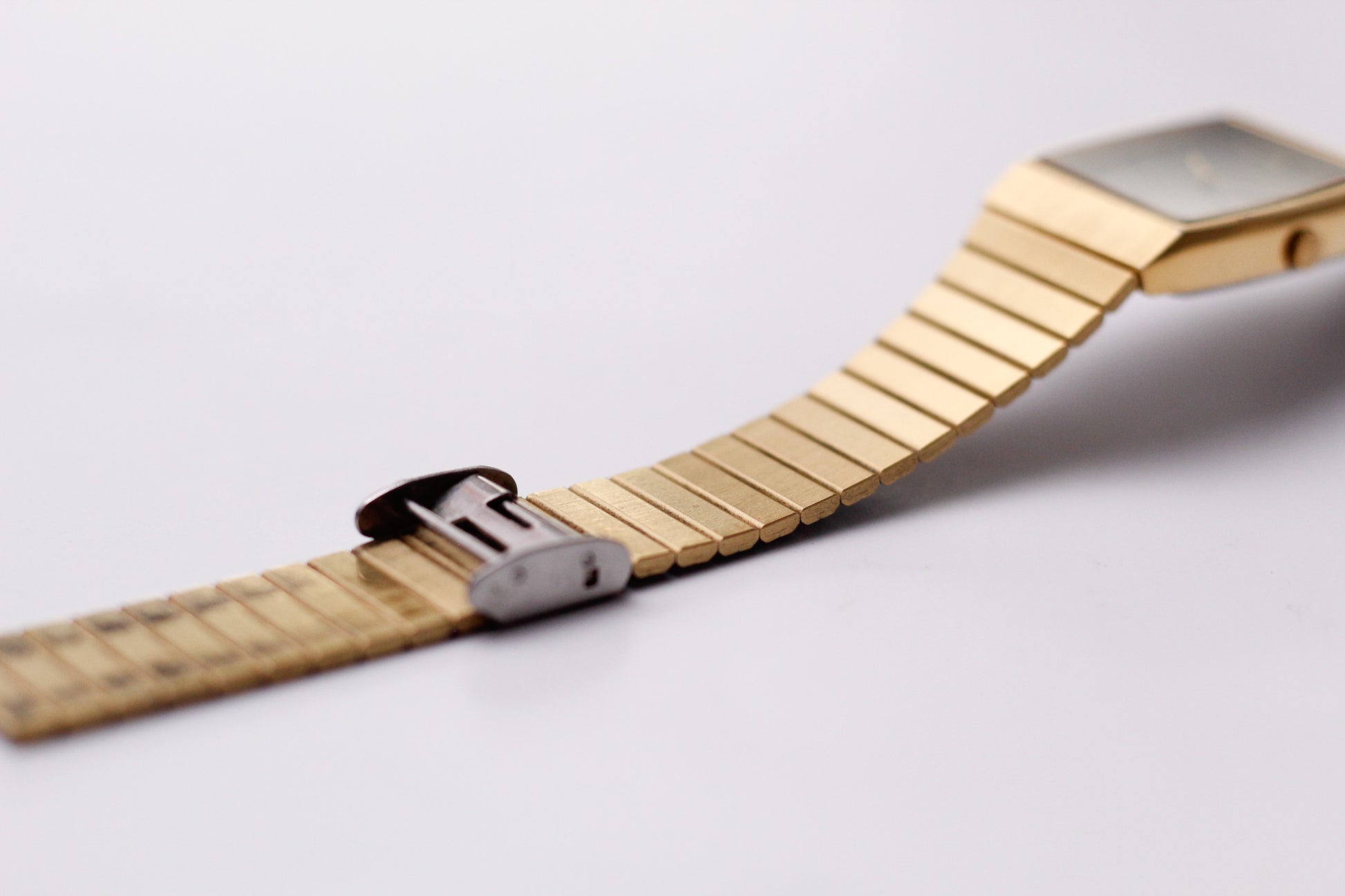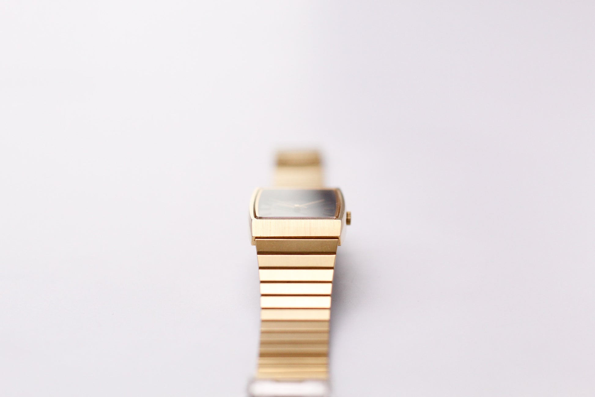 Housing this watch is a beautiful gold toned rectangle case that highlights its mirror polishing and delicate curves.