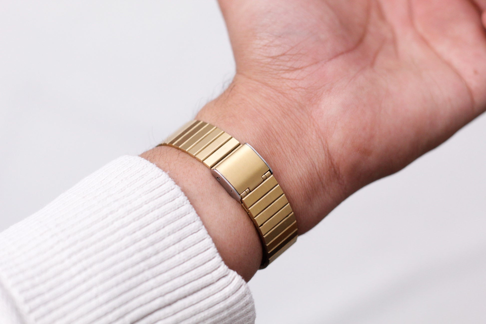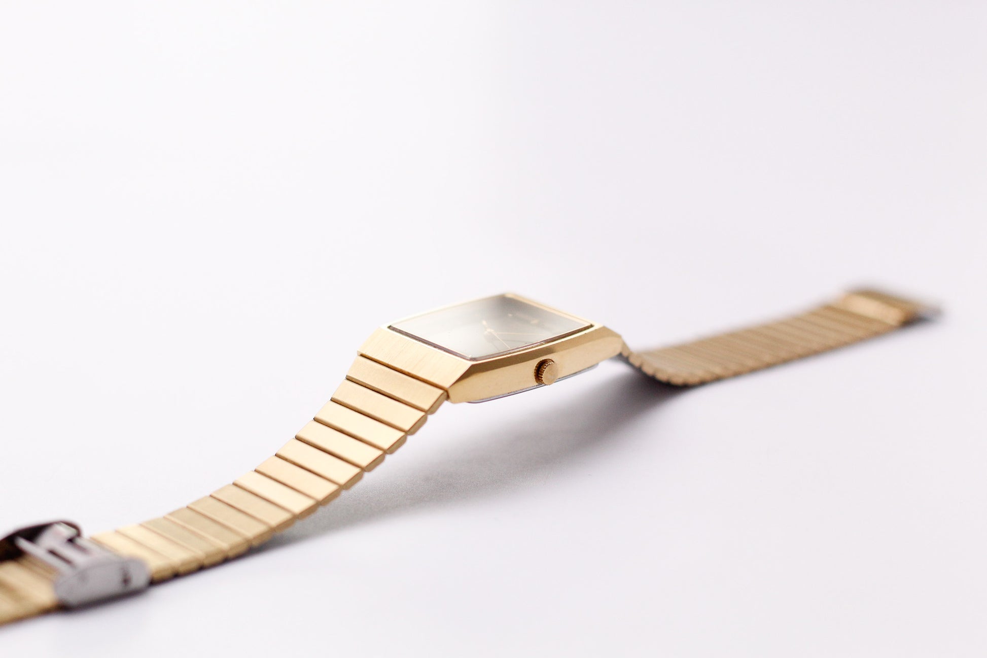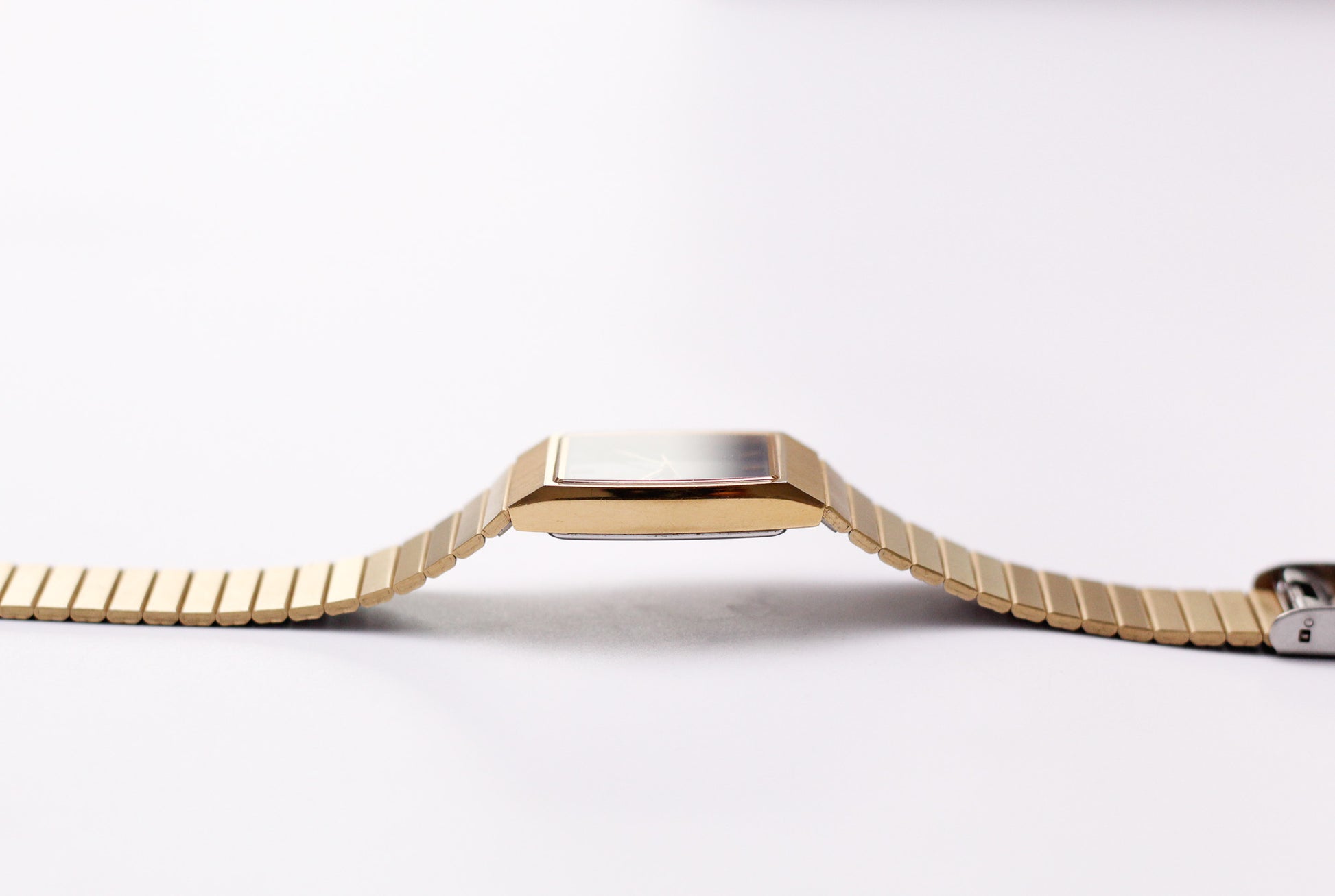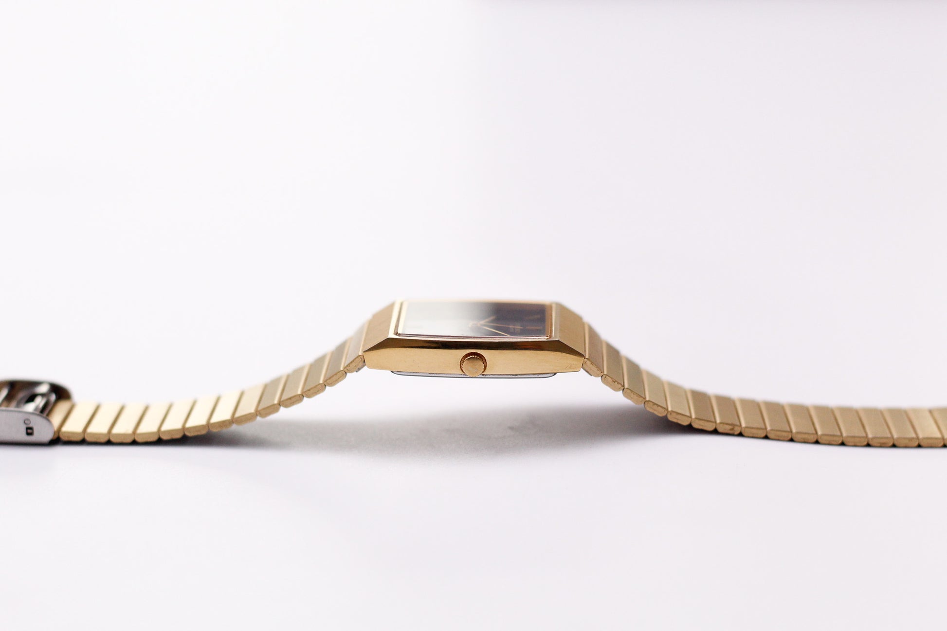 Housing this watch is a beautiful gold toned rectangle case that highlights its mirror polishing and delicate curves.