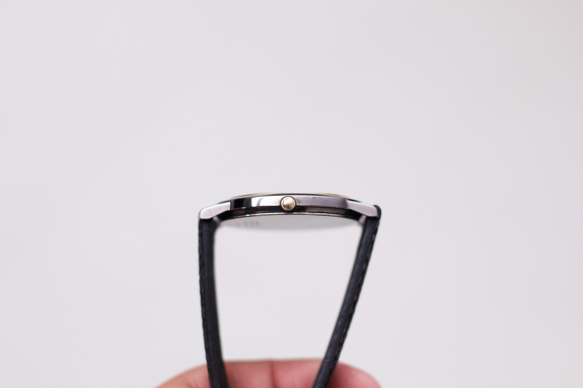This watch features a stunning inky black dial that is paired with mirror polished gold toned hands and a gemstone at the 12 o’clock position.