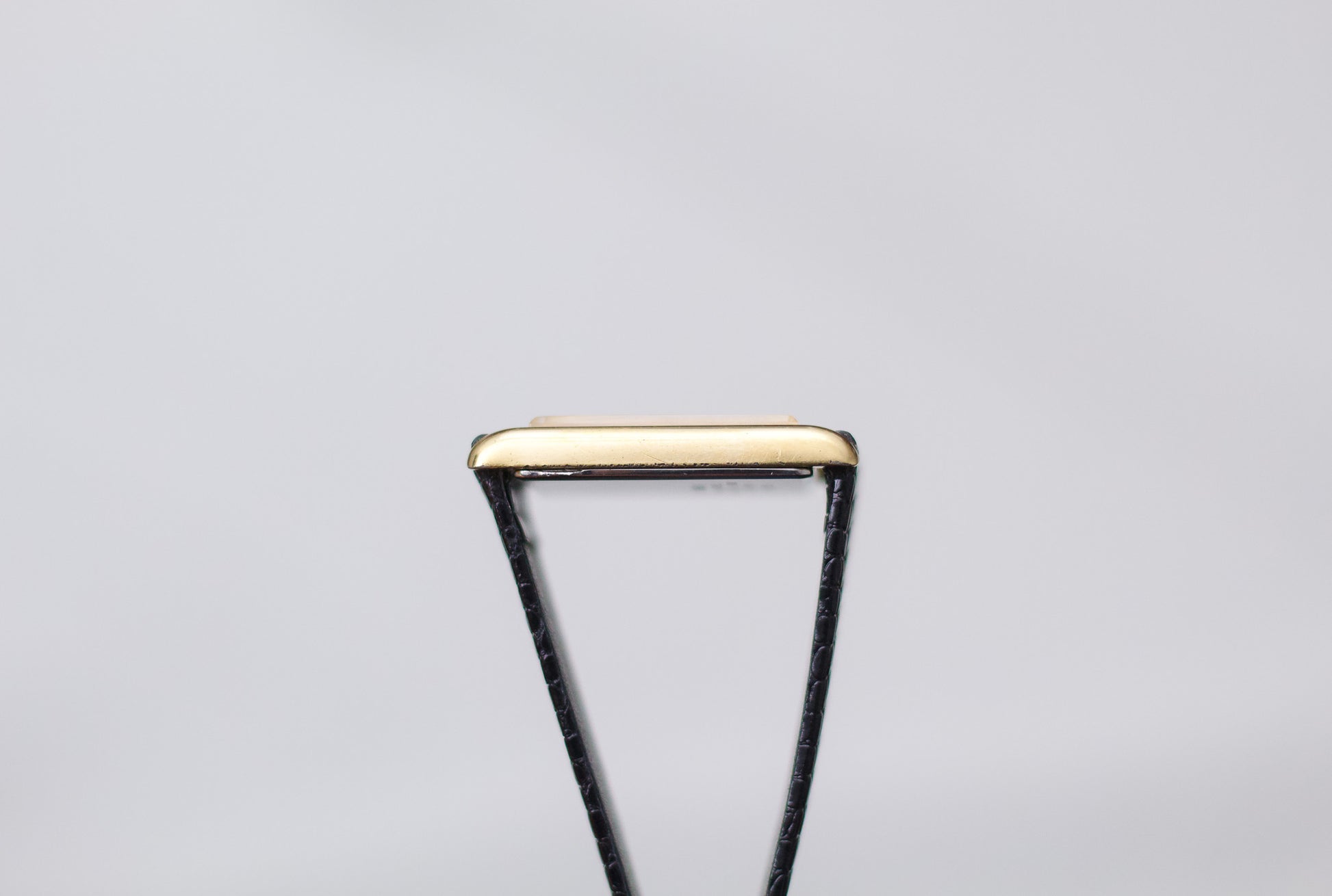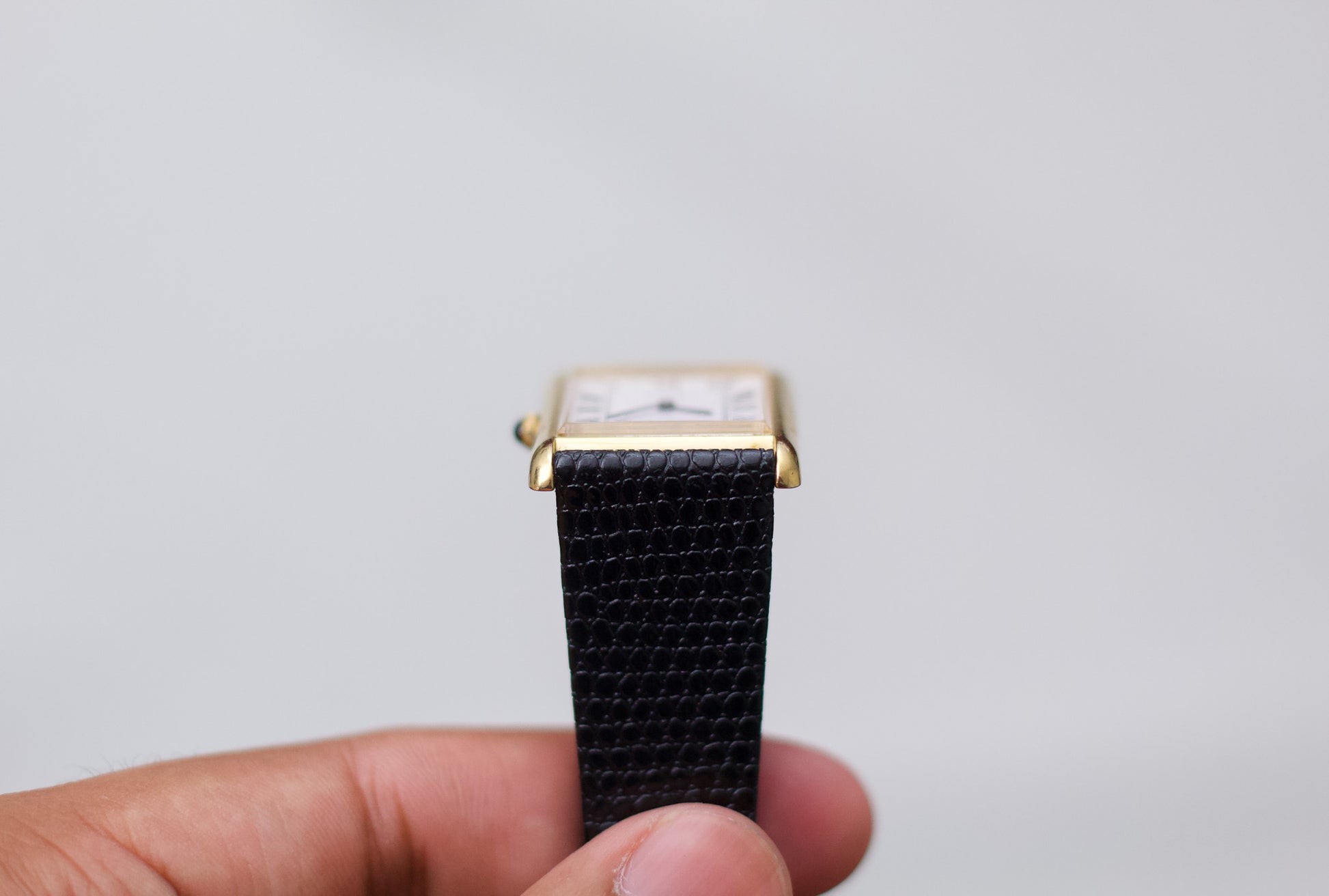 This watch features the iconic roman numerals bordering the rectangular white dial and in the center are the inky black hands.