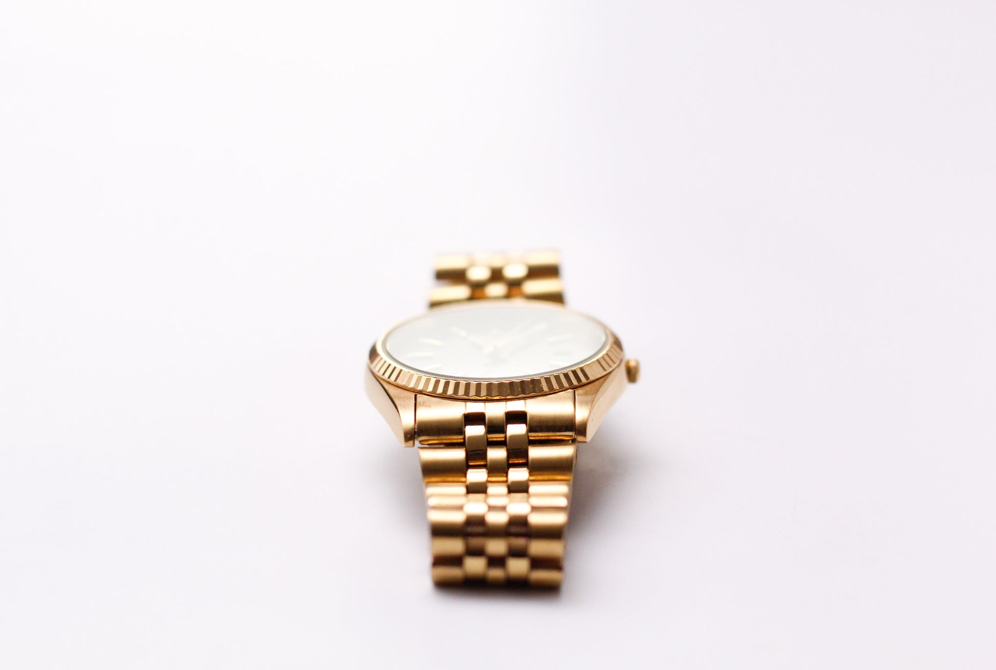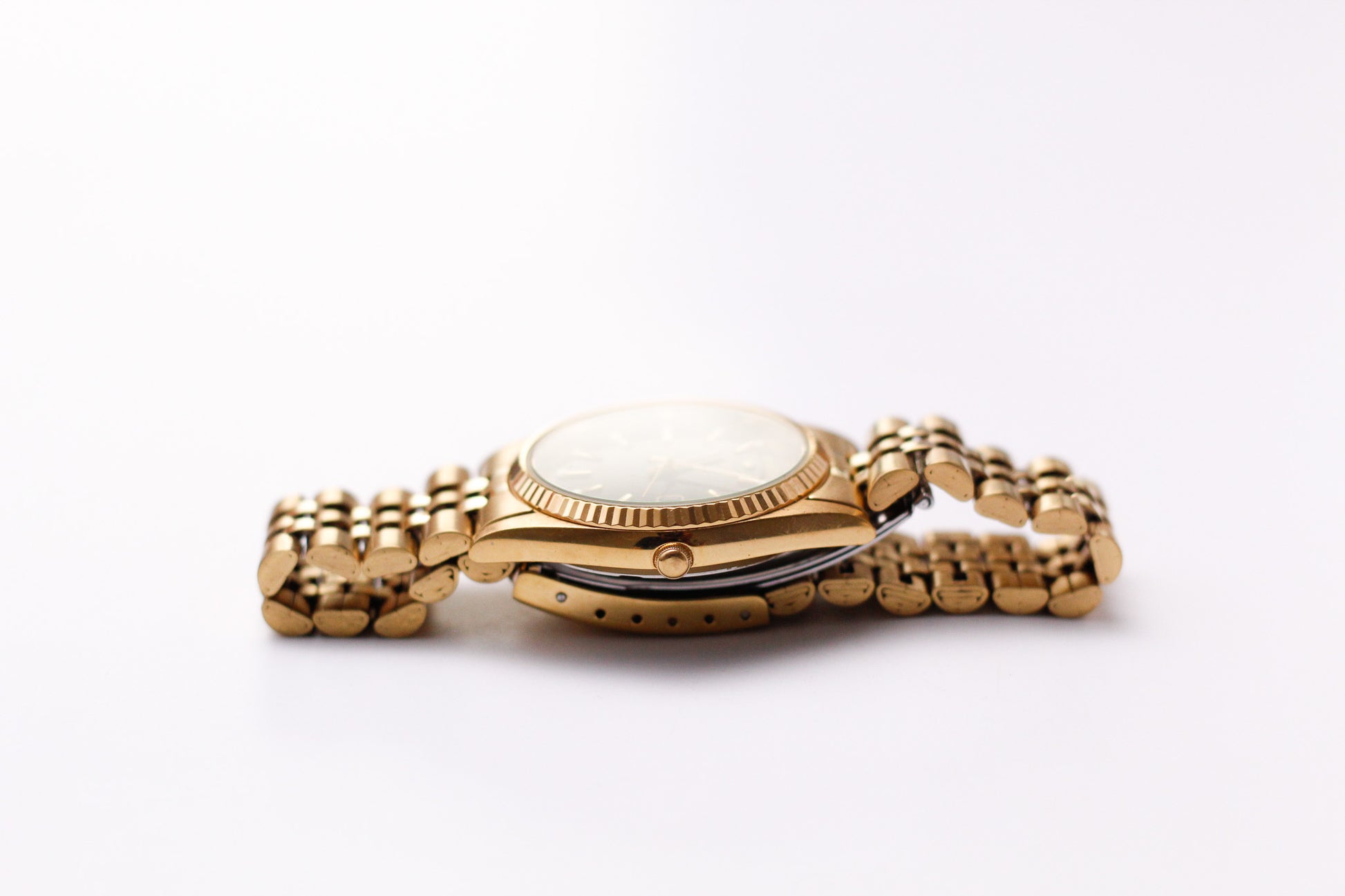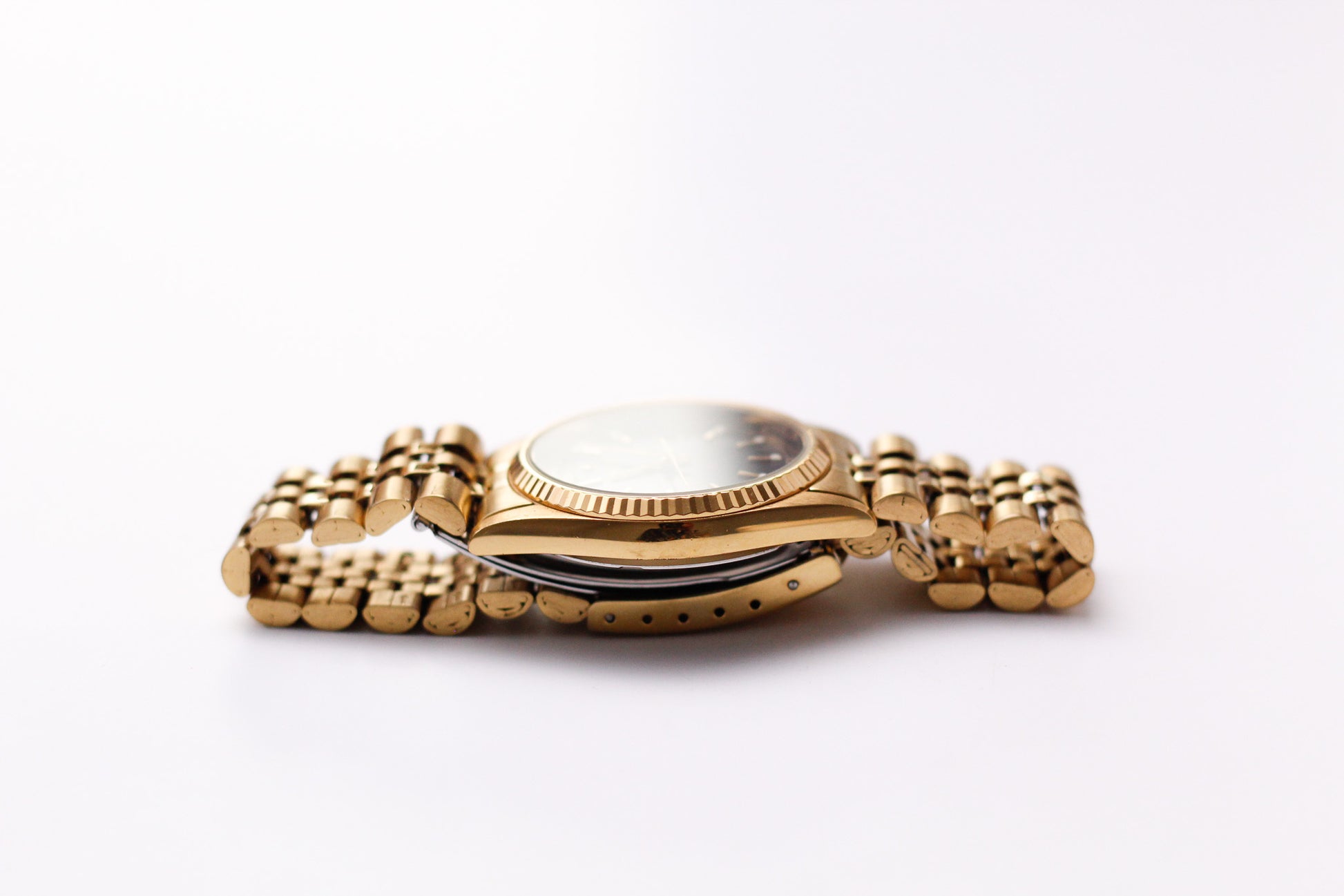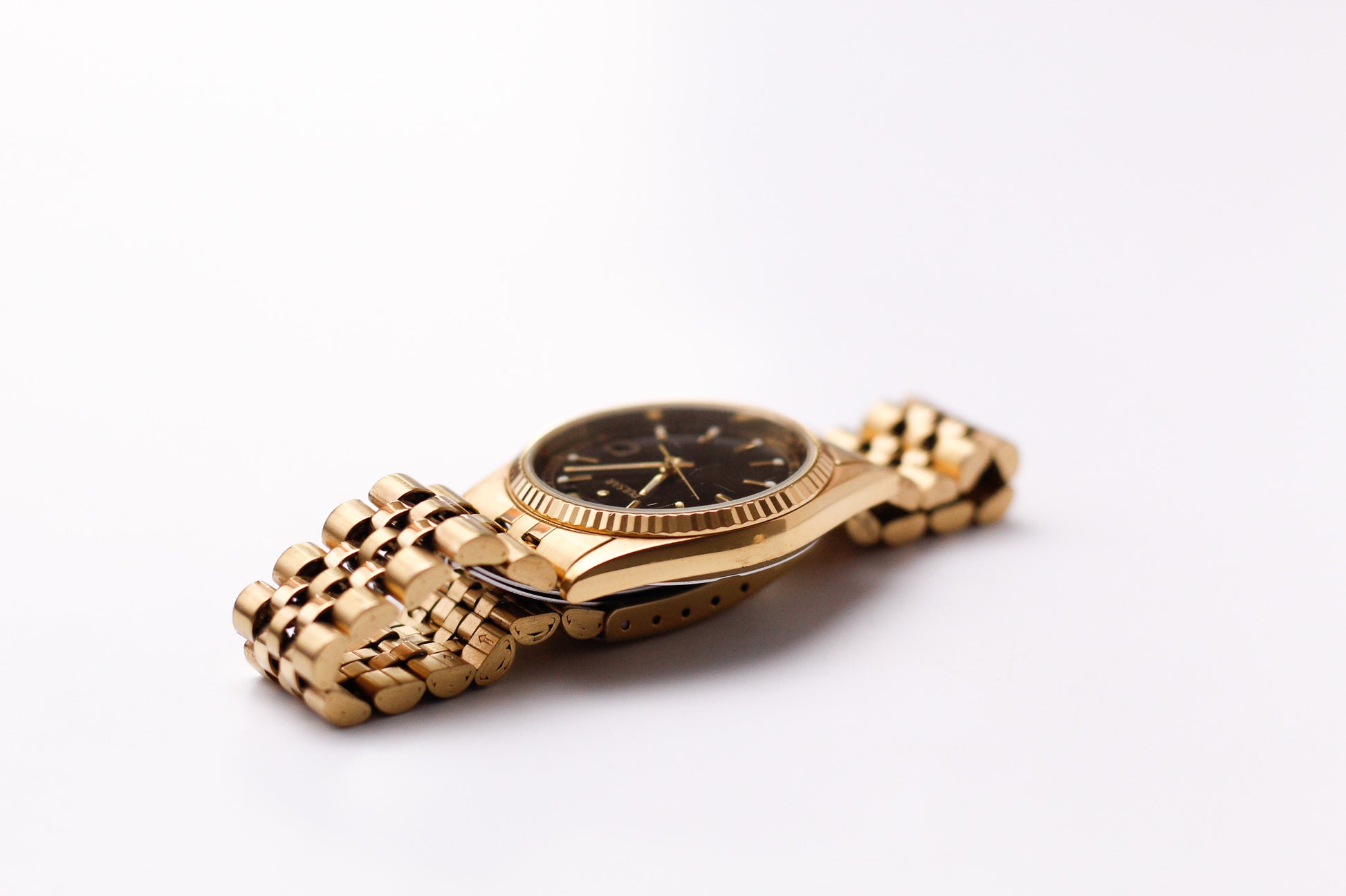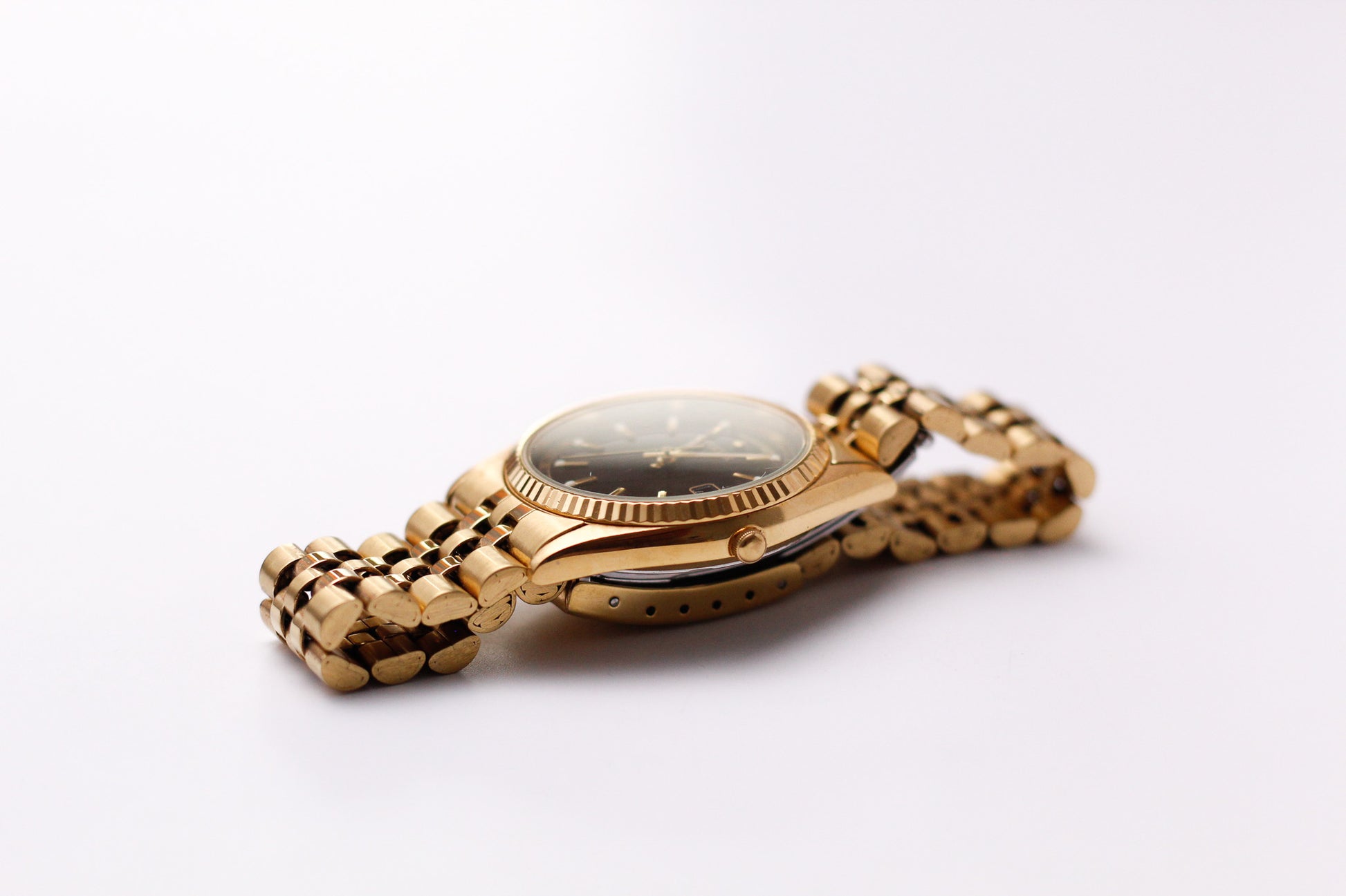 A stunning black sunburst dial is the star of the show and is paired by gold toned indices and hands. Adorning the dial is the fluted bezel.