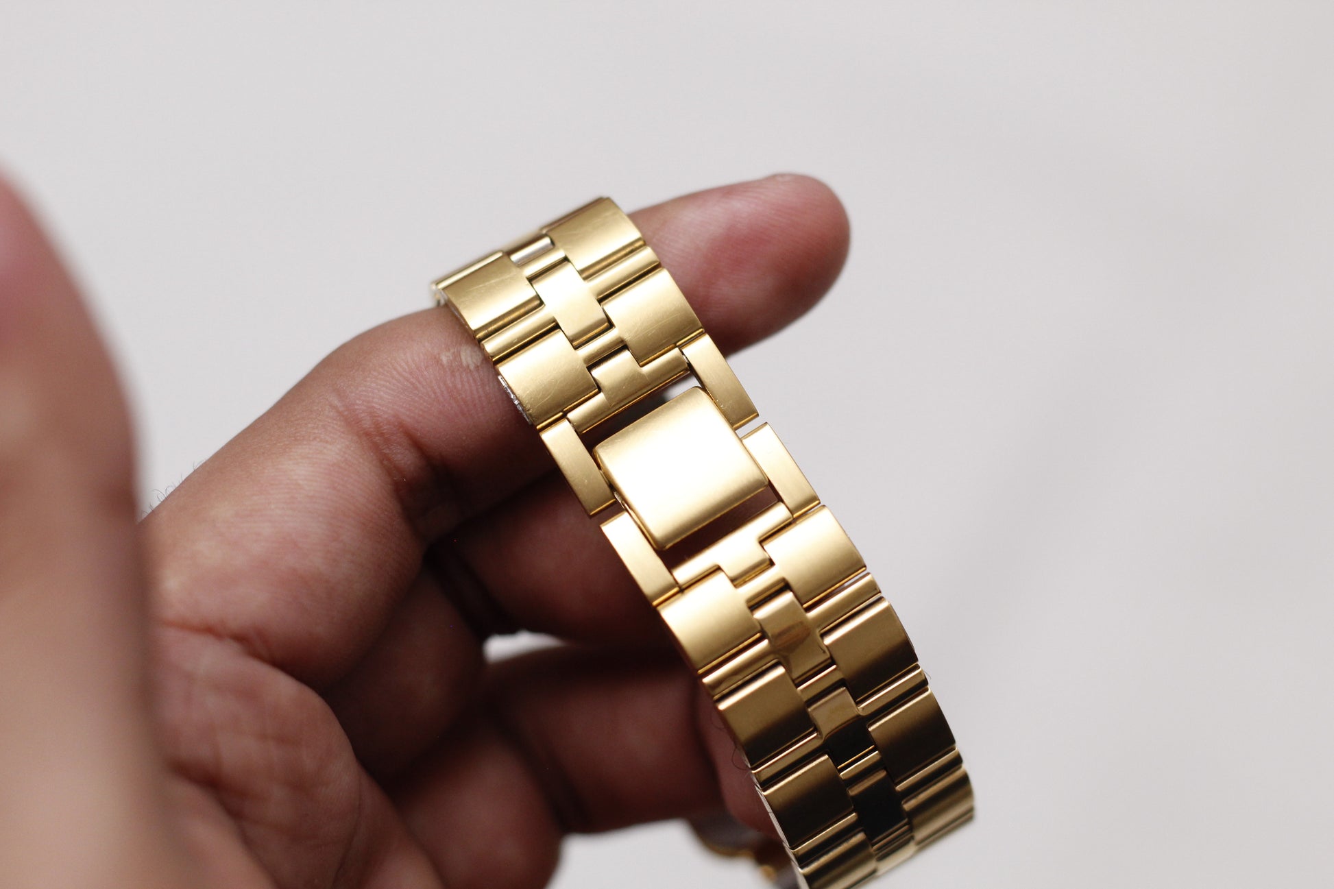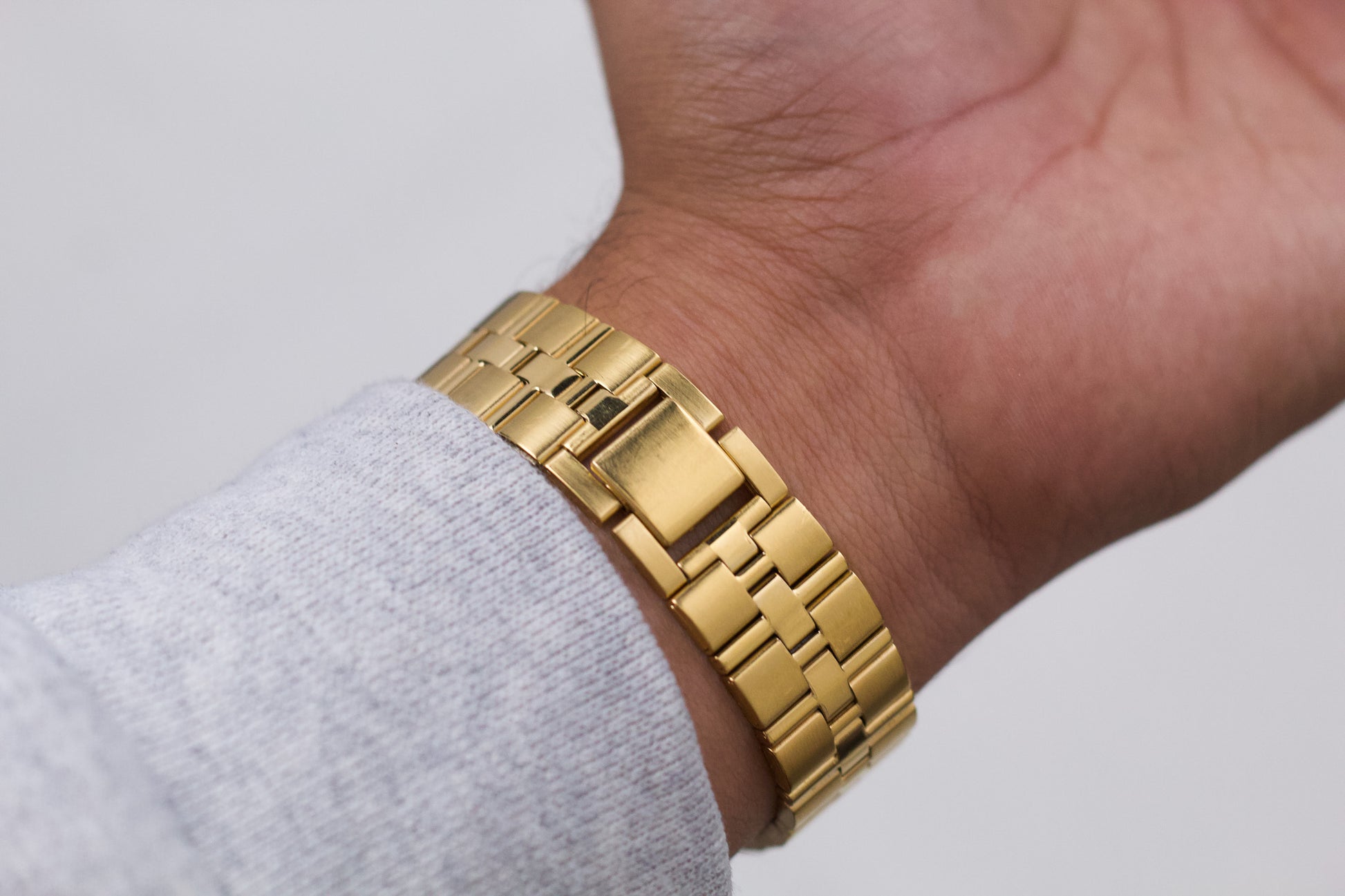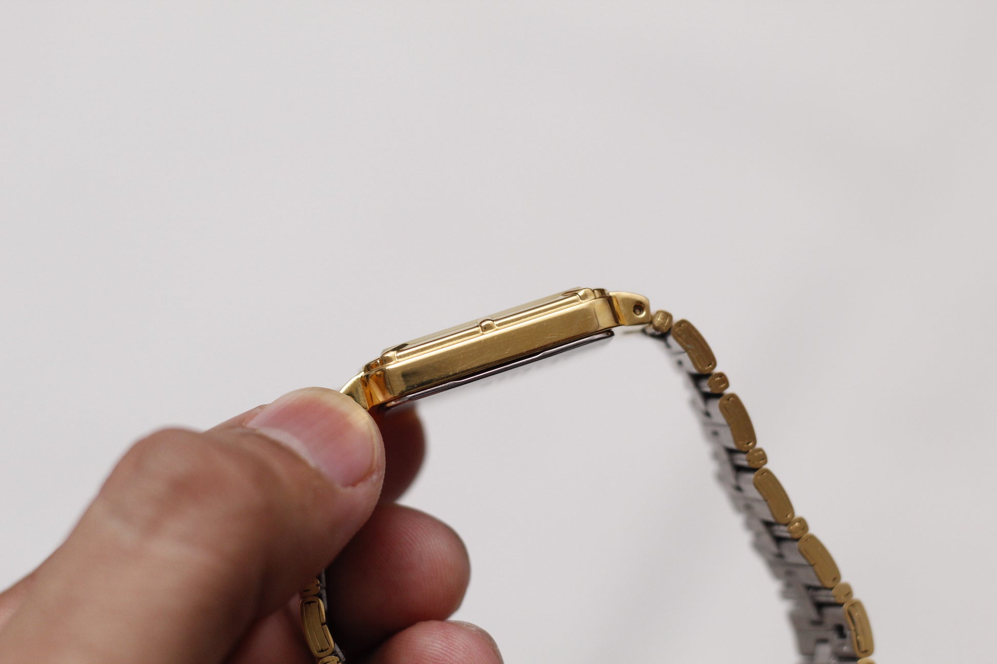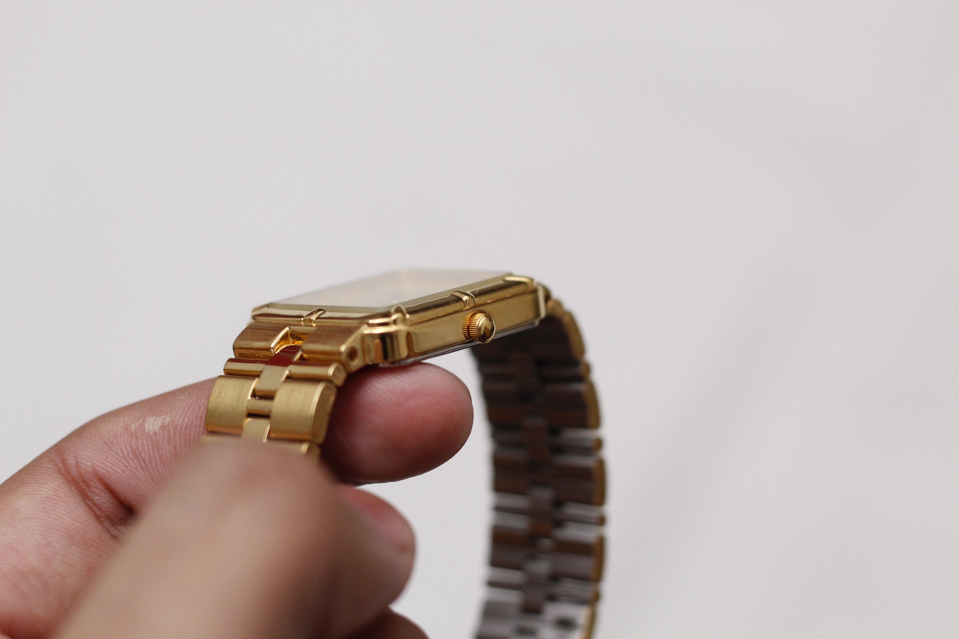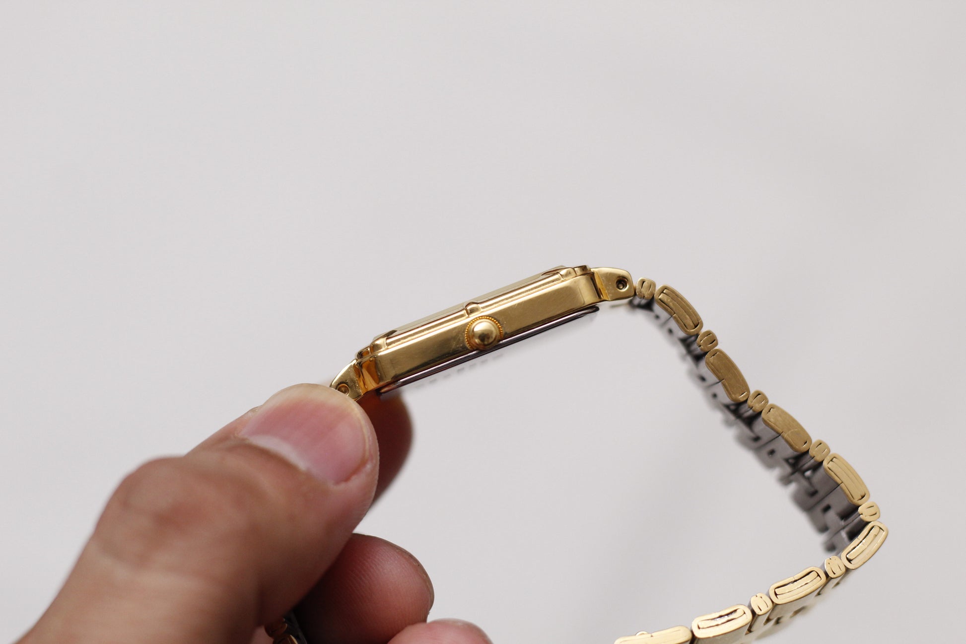 Housing this watch is a gold toned tank style case with an integrated bracelet.