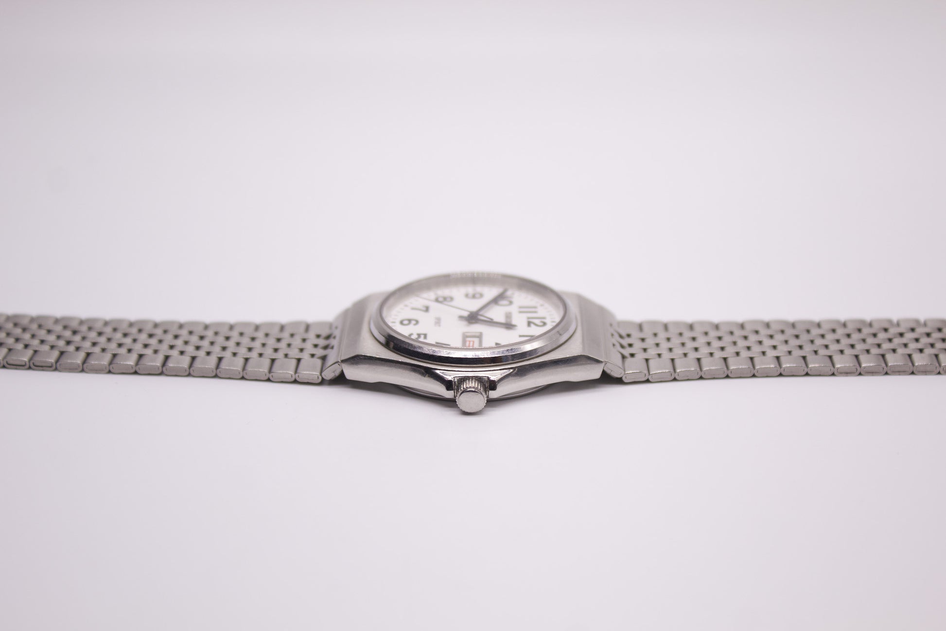 The watch features a stark white railway dial.