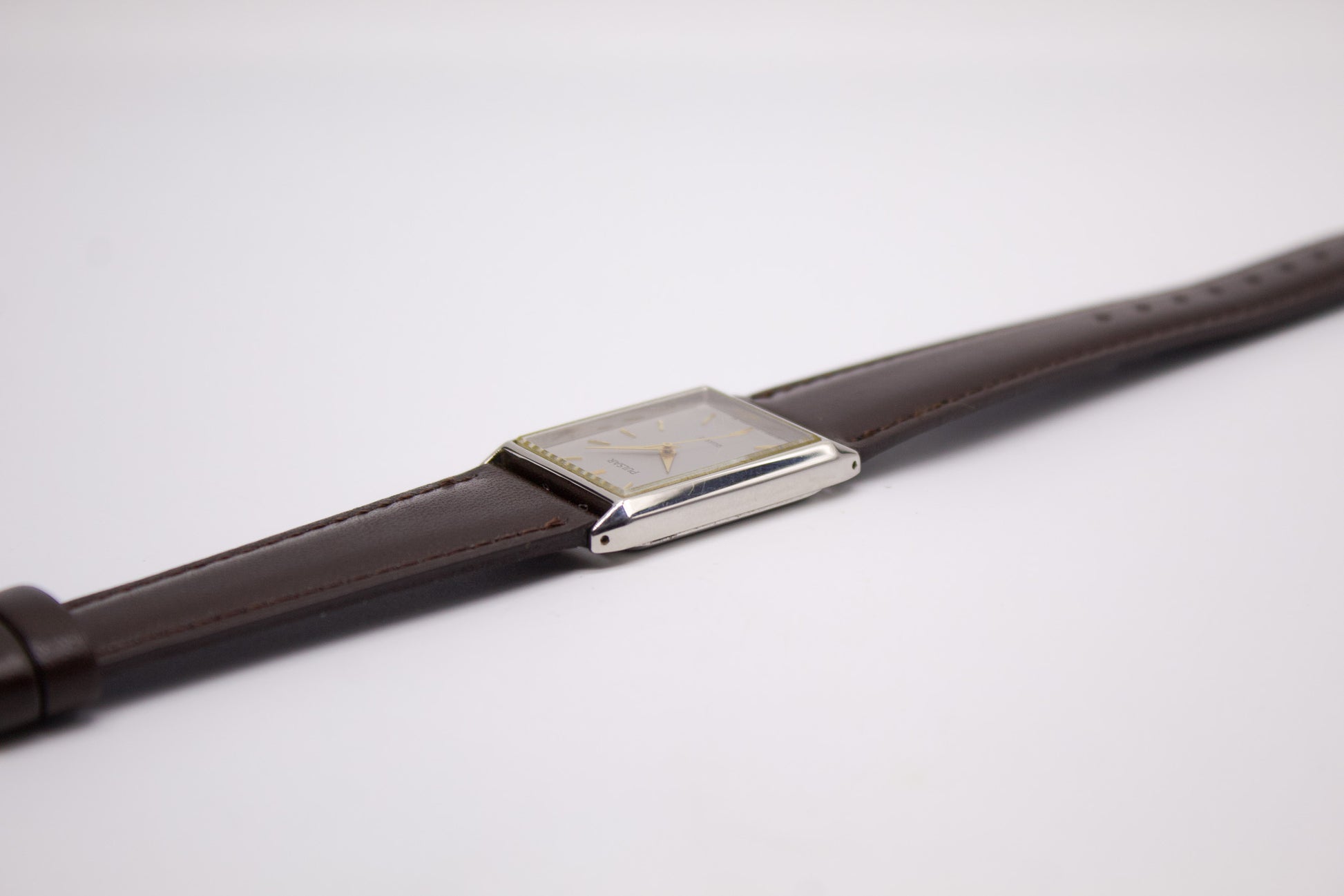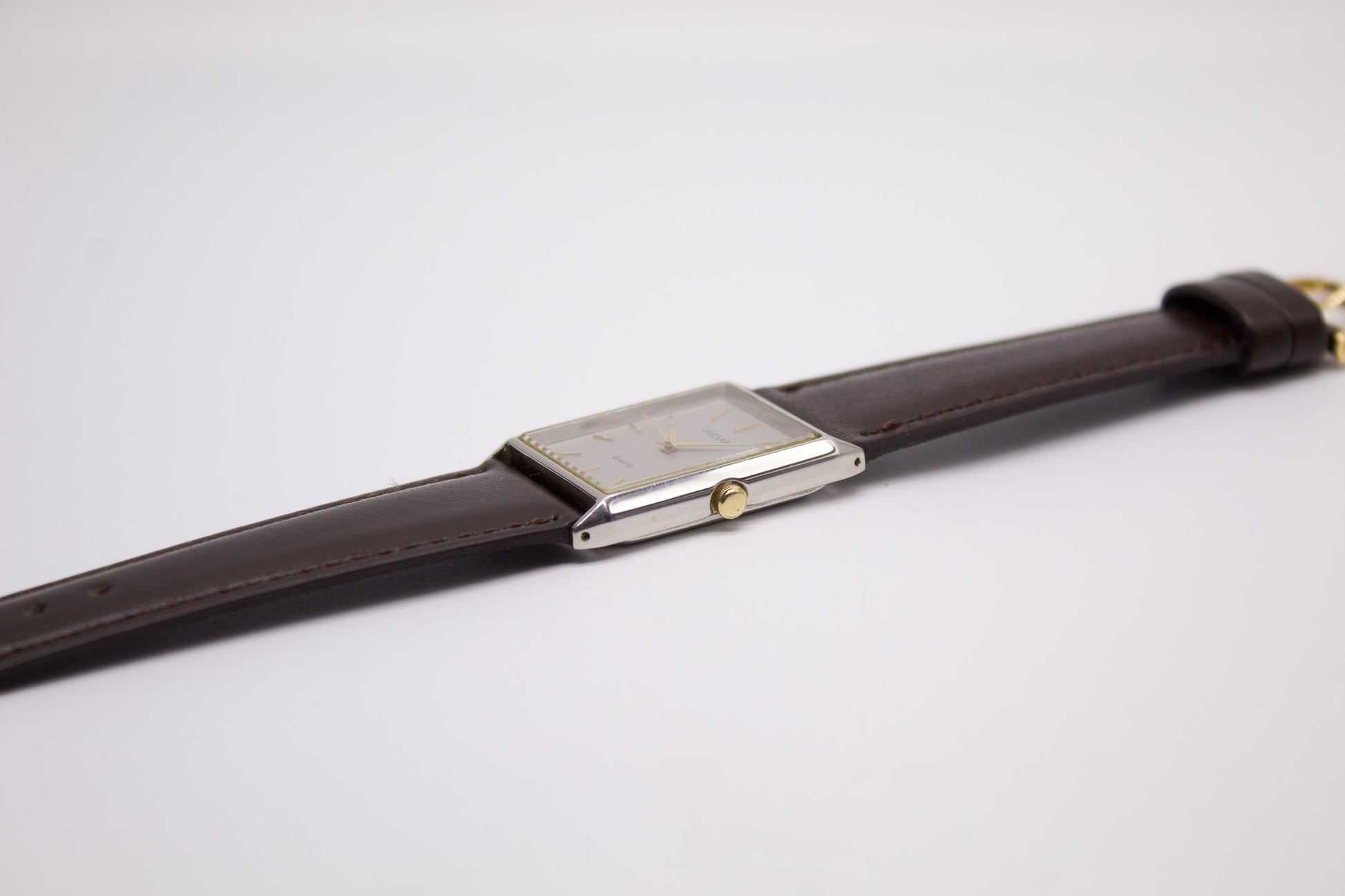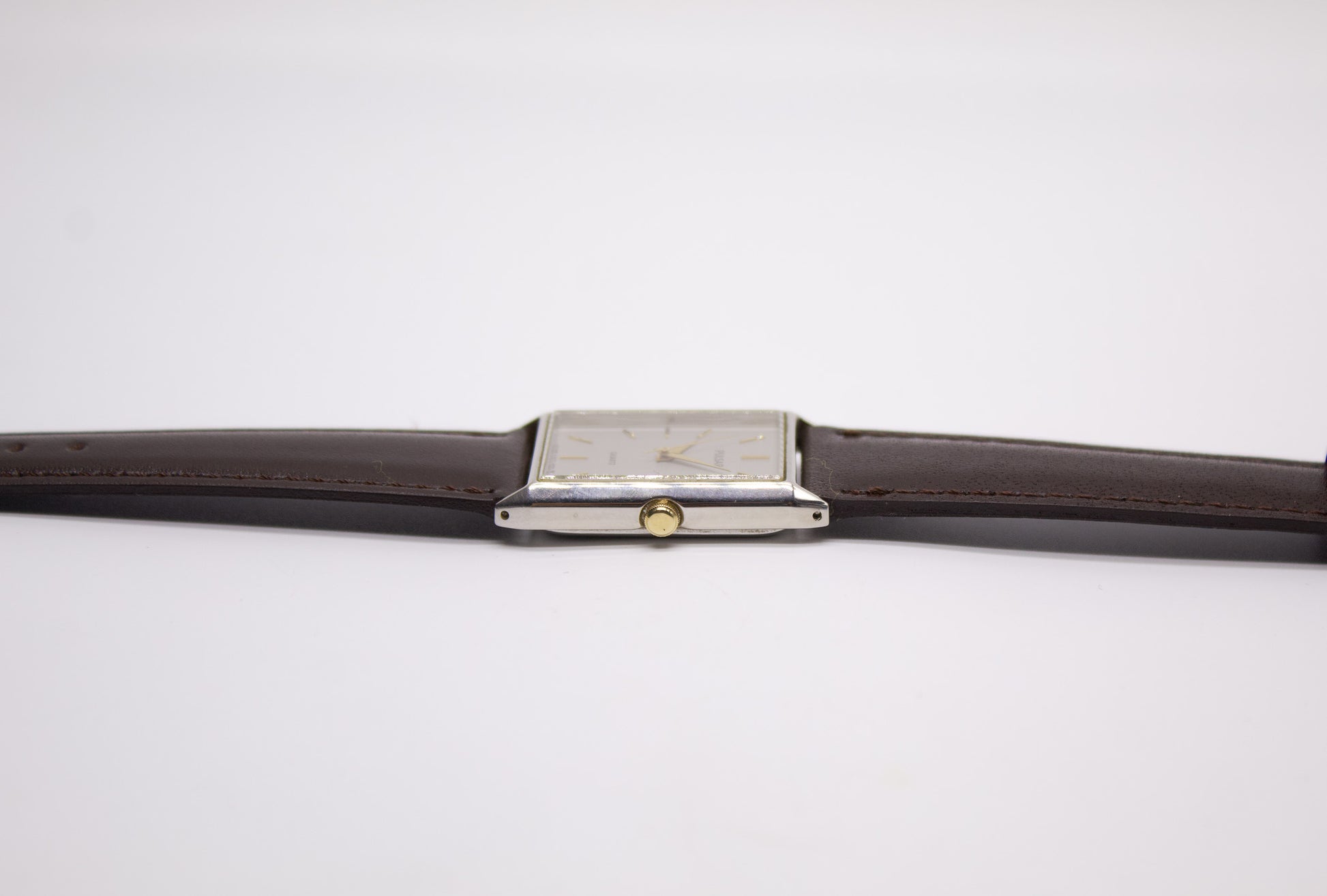 Housing this watch is a tank style case that is paired with a comfortable leather strap.