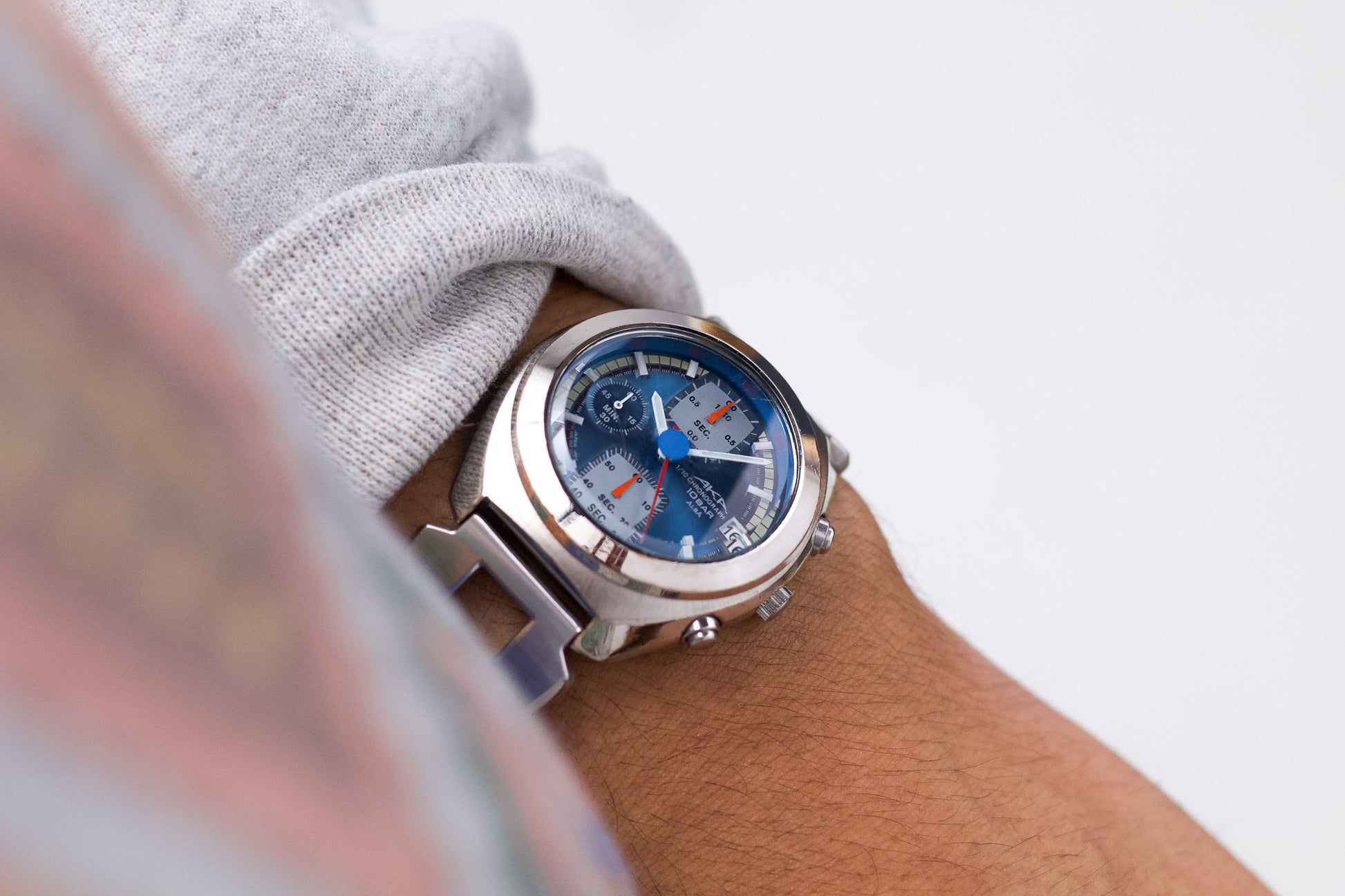 This Alba AKA features a sky blue sunburst dial that is paired with matte white indices and a mix of white and red hands for a great contrast; and of course we cannot forget to mention the blue dot placed at the center of the crystal.