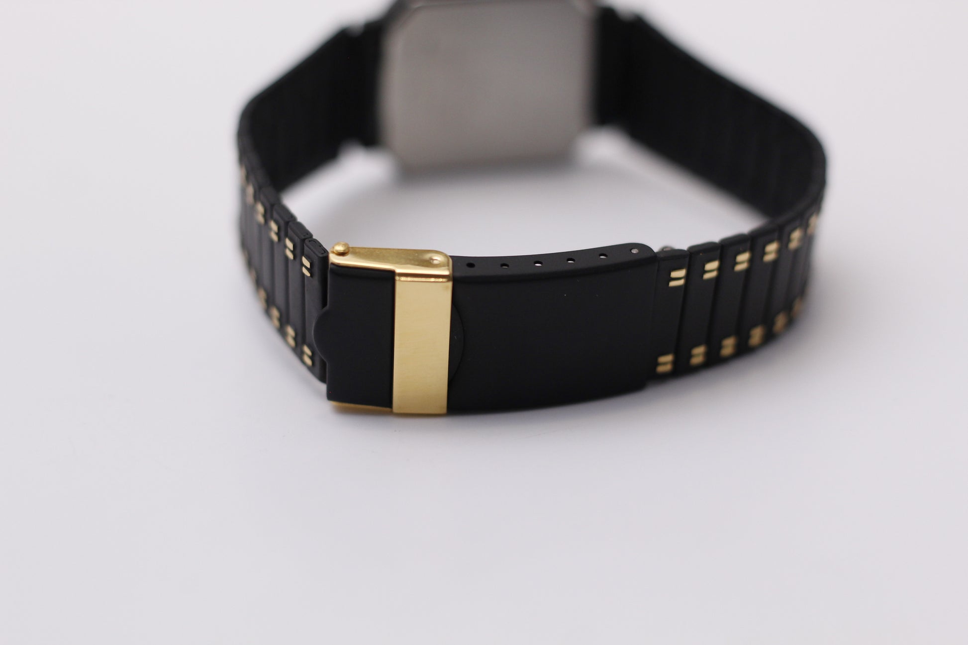 Case: Housing this watch is a black case that is paired with a two tone black and gold speidel bracelet.