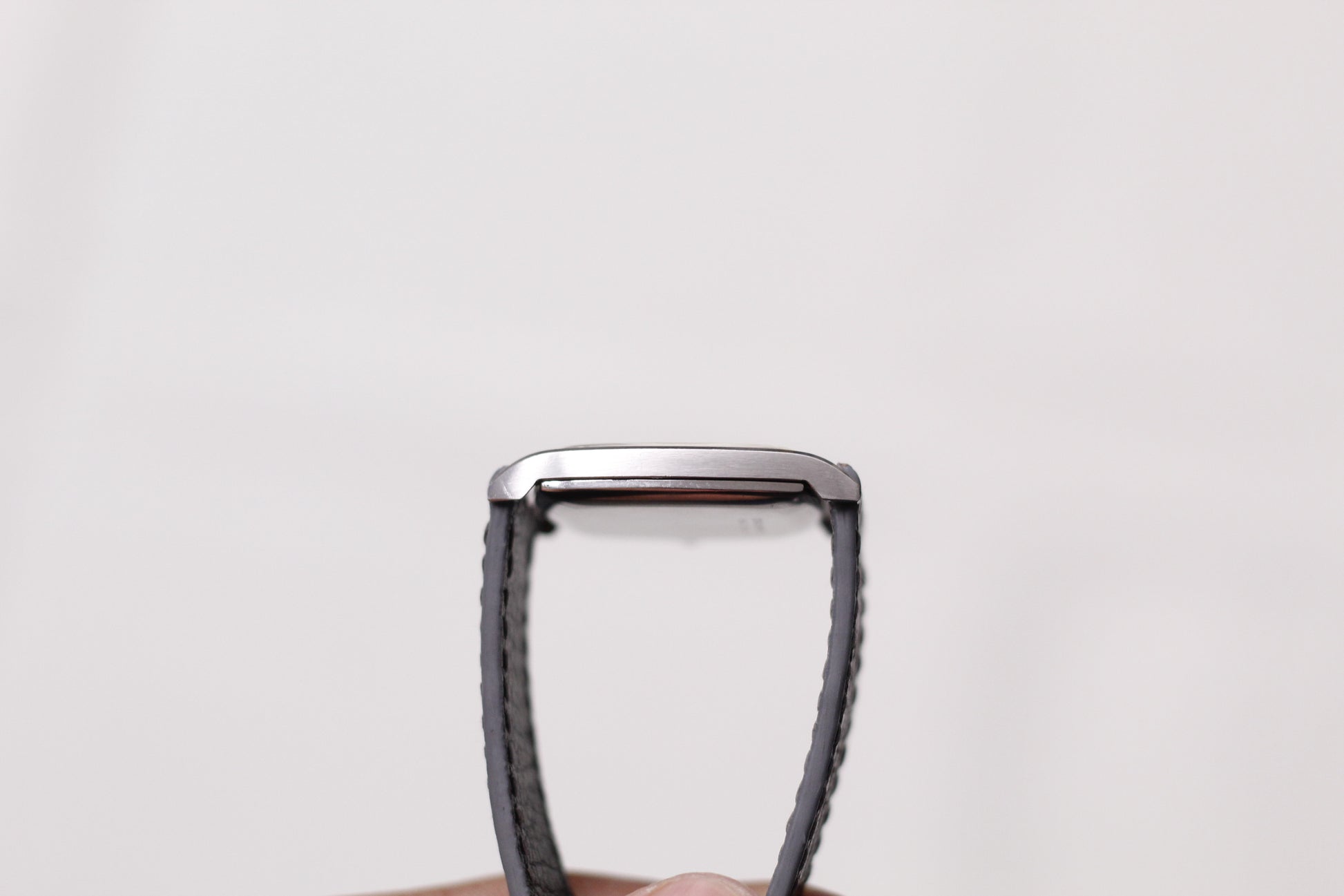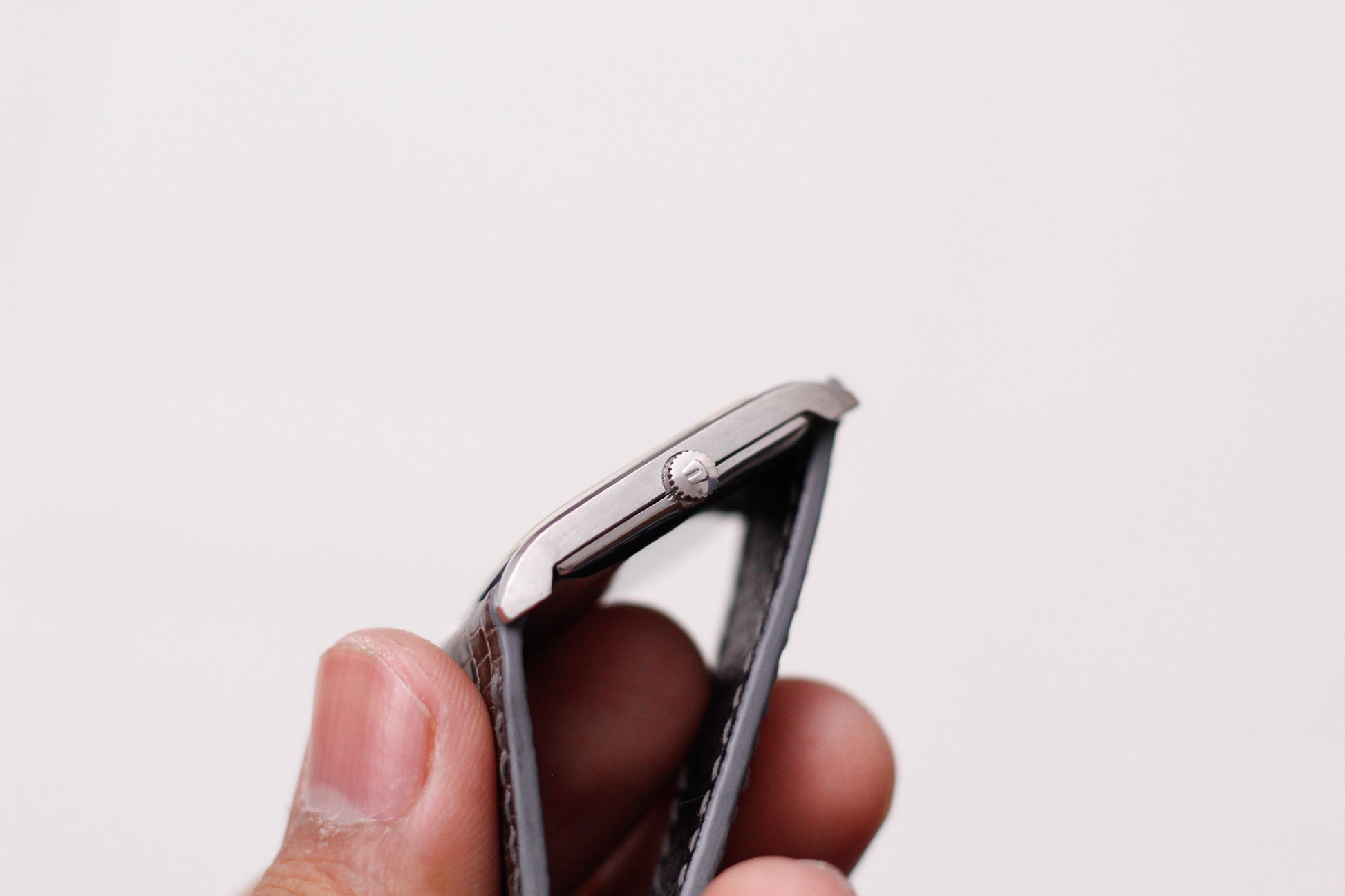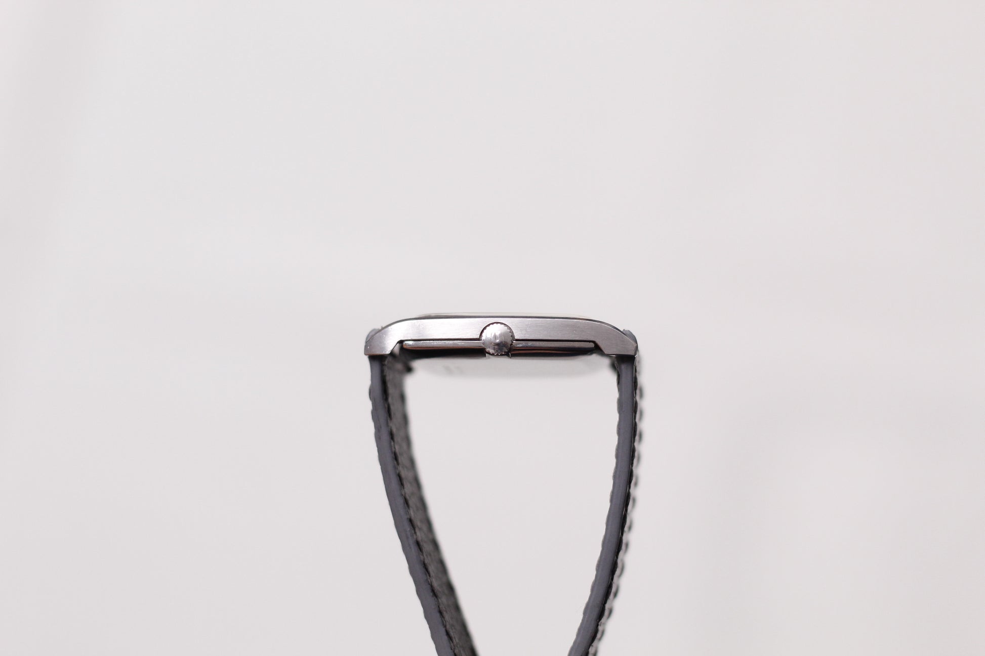 Housing this watch is a tank style solid stainless steel case with a signed crown.