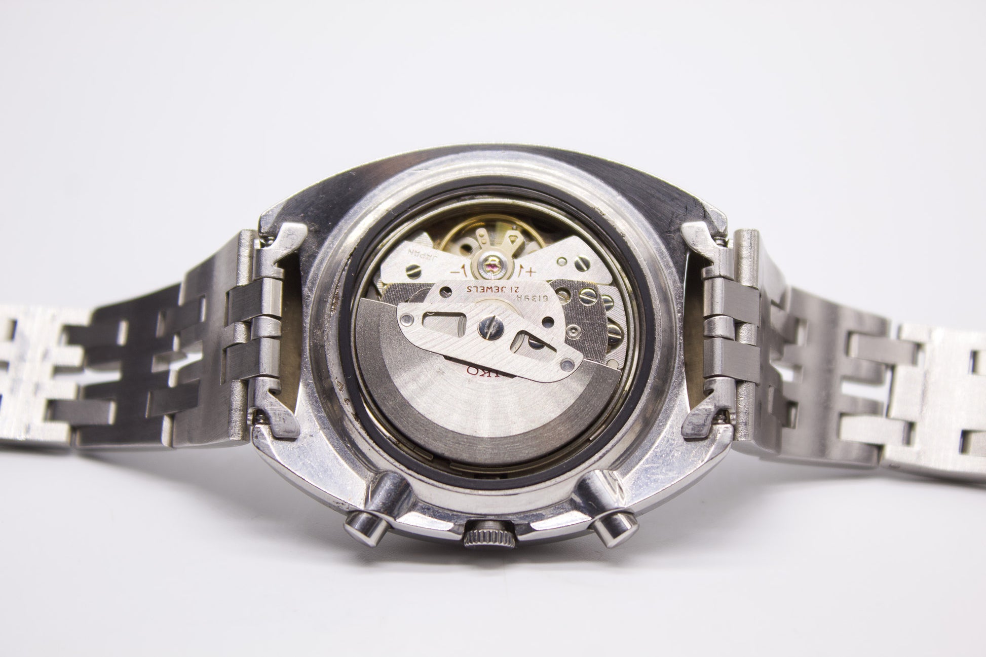 Powering this watch is the iconic Seiko 6139A 21-jewel automatic chronograph which was the first commercially available automatic chronograph in the world. This movement also offers a day-date in both English & Kanji with a quick-set by pressing in the crown.