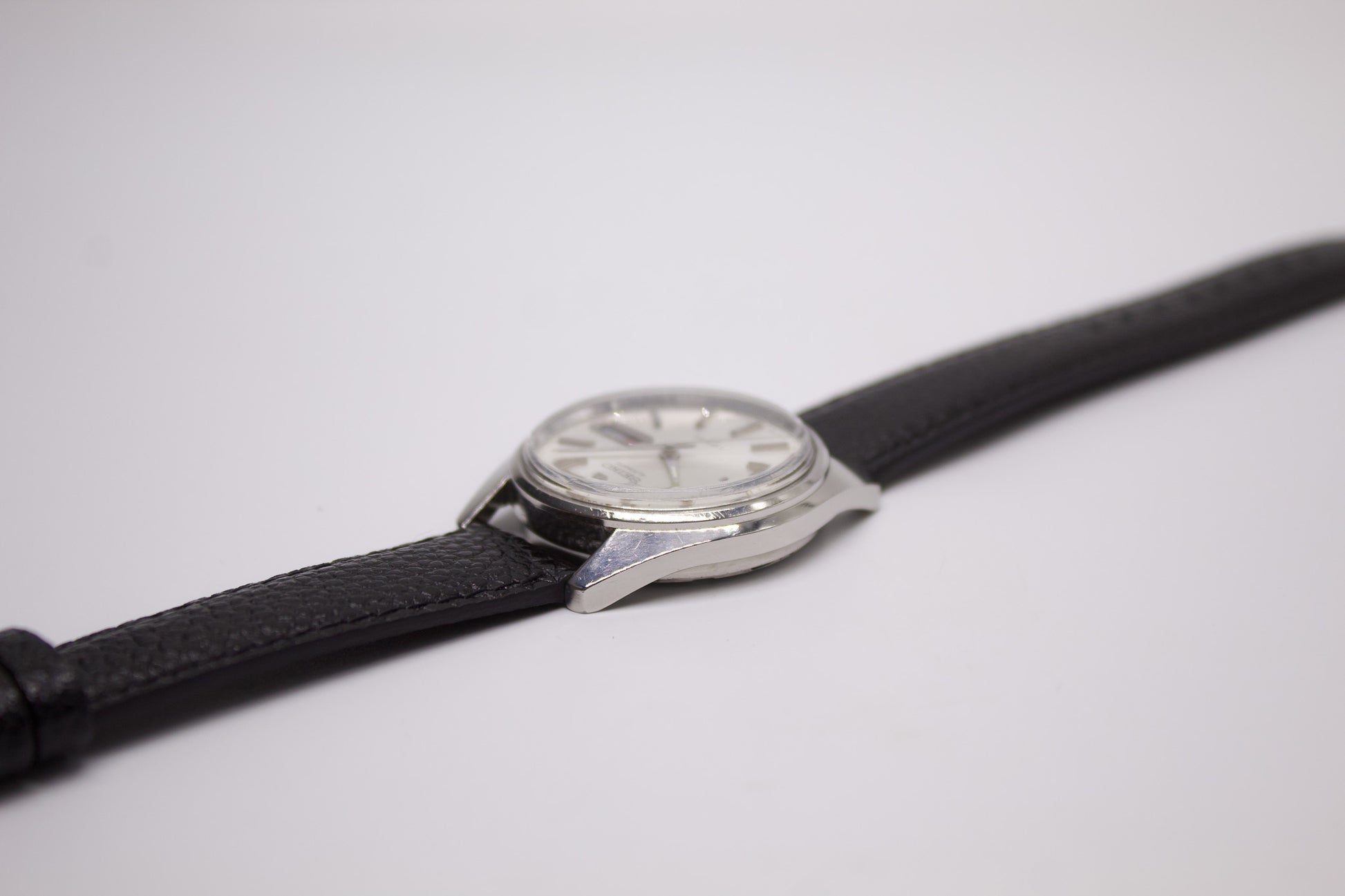 This watch features a bright silver sunburst dial that is paired by mirror polished indices and sharp hands that easily transition from a bright white to deep inky black depending on the angle of the lighting.